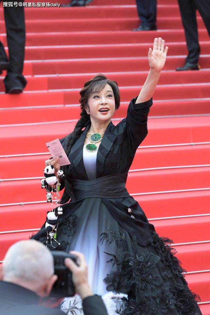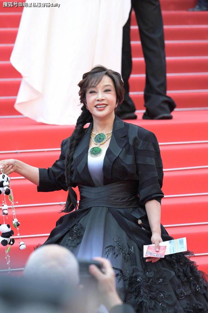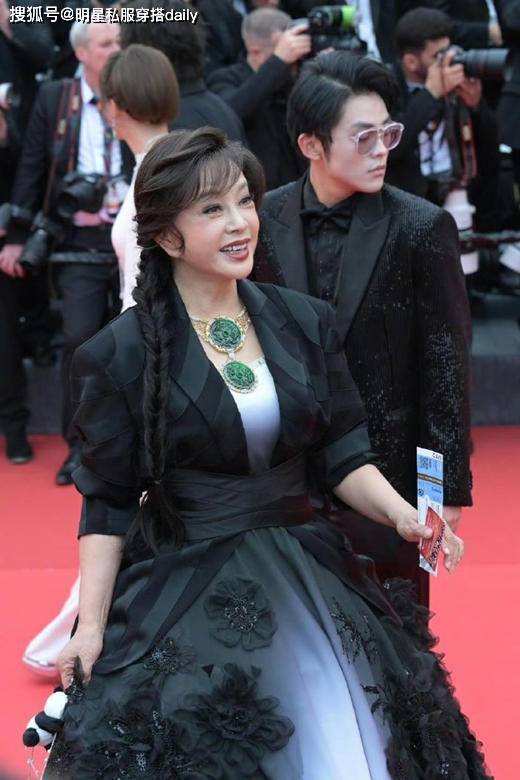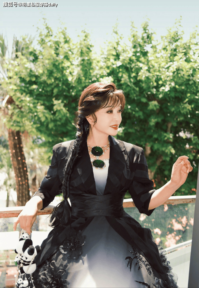 这件造型的亮点在于细节设计。黑白渐变的蓬蓬裙营造出高贵雍容的气质,裙身还融入了柱子状元素和牡丹花纹等中式象征,充分展现出她对民族文化的自信与自豪。整套造型的核心是那枚超大 Sized 的翡翠项链,分量与气场并重,极易成为全场的视觉焦点。刘晓庆则凭借自身的强大气场与稳健身材,轻松驾驭这类大胆的珠宝配饰。